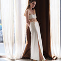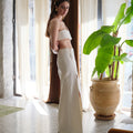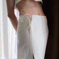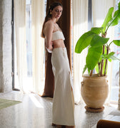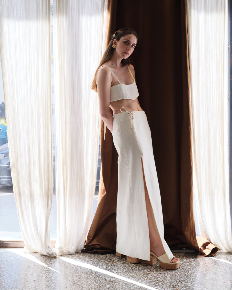 "La Longue Jupe" skirt is a long length skirt. It features a high side slit and a side cut-out, revealing the skin and elongating the silhouette. The cord details add a romantic touch. The skirt delicately drapes over the silhouette, providing comfort and effortless movement.
